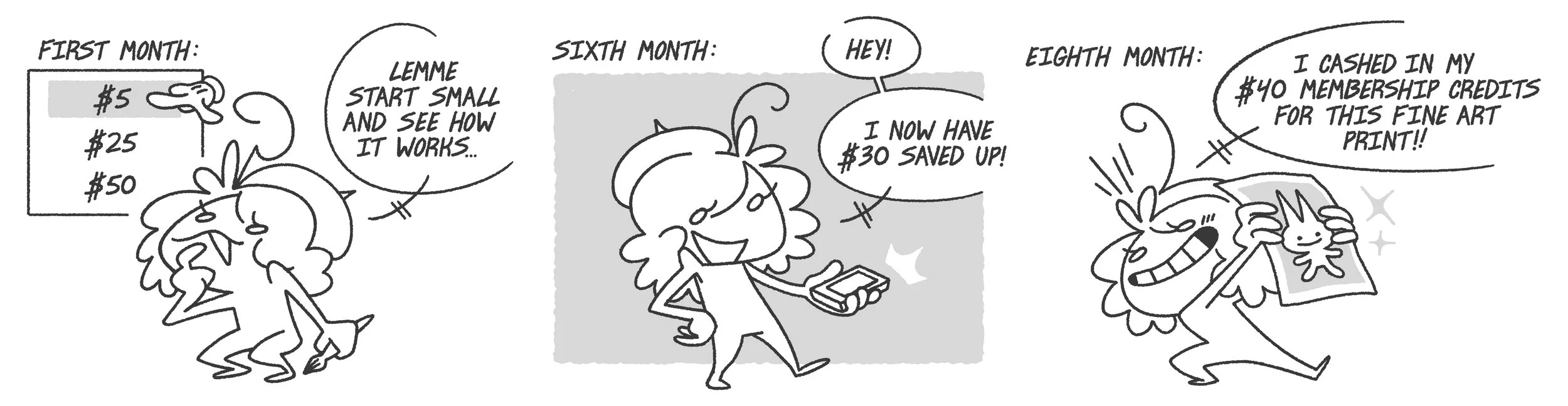 Whatever money you save up in your account as a member can be redeemed when you need it for things like professional artwork digitization (photography/scanning), fine art prints, headshot shoots, video shoots, booking the studio for a day, making new business cards, fliers, catalogues, t-shirts, pins, patches, buttons, graphic design, website design, fine art installation, copywriting, vinyl cutting, photo retouching, private consultation and more!